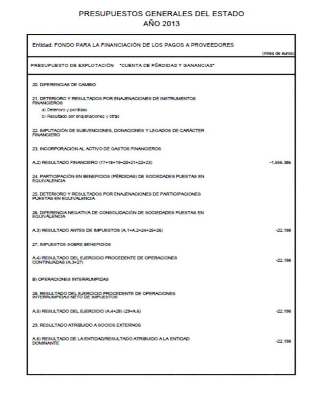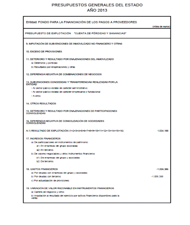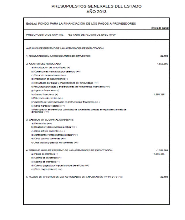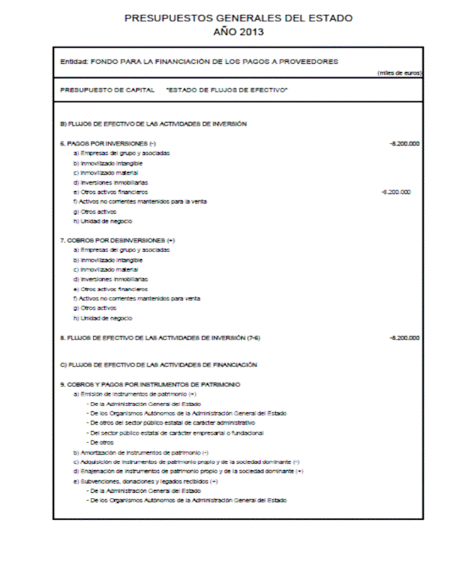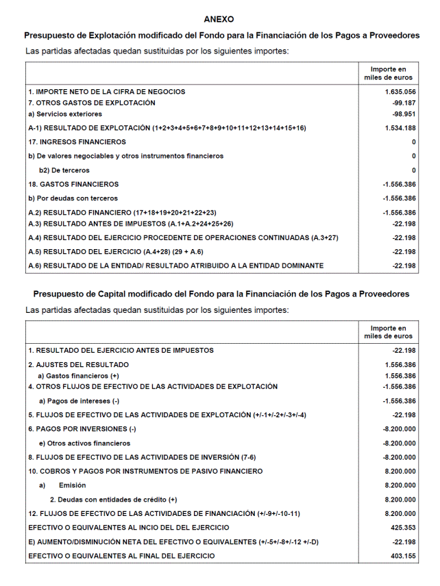 Como consecuencia del incremento neto máximo de las deudas financieras a corto y largo plazo por importe de 8.200.000 miles de euros del Fondo para la Financiación de los Pagos a Proveedores, se aprueban las modificaciones de los Presupuestos de Explotación y Capital del Fondo para la Financiación de los Pagos a Proveedores en los términos previstos en el anexo de este Real Decreto-ley.