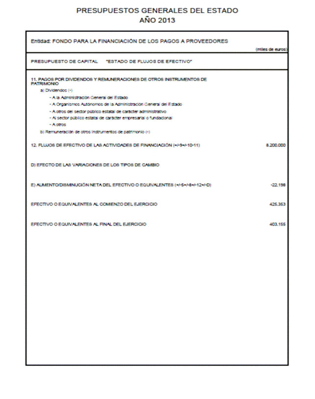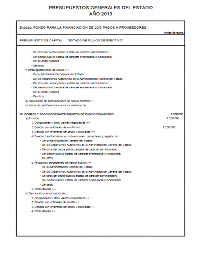 Se adiciona en el anexo III de la Ley 17/2012, de 27 de diciembre, de Presupuestos Generales del Estado para el año 2013, el Fondo para la Financiación de los Pagos a Proveedores por un importe de 8.200.000 miles de euros. Esta cifra se entenderá como incremento neto máximo de las deudas financieras a corto y largo plazo entre el 1 de enero y el 31 de diciembre de 2013.