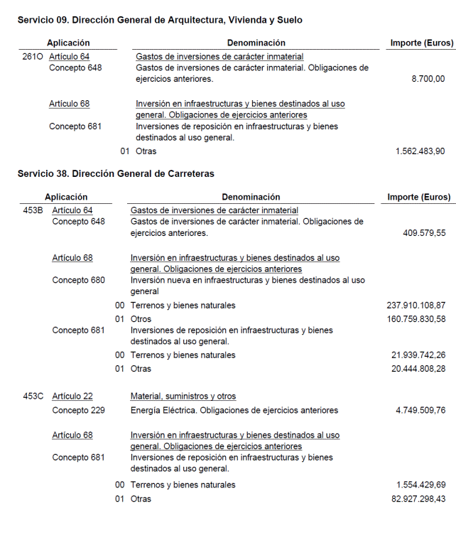 Al Ministerio de Fomento corresponden un total de 540.692.050,73 euros que derivan mayoritariamente de expropiaciones, revisiones de precios, certificaciones finales, intereses y liquidaciones de obras de la Dirección General de Carreteras por importe de 492.163.523,83 euros así como obligaciones relativas a conservación integral y de energía eléctrica de la propia Dirección General de Carreteras por importe de 38.531.783,59 euros. Por su parte, la Dirección General de Ferrocarriles debe atender obligaciones por importe de 8.425.559,41 euros correspondientes a expropiaciones, liquidaciones de obra e intereses de demora y la Dirección General de Arquitectura, Vivienda y Suelo por importe de 1.571.183,90 euros relativas fundamentalmente a certificaciones.