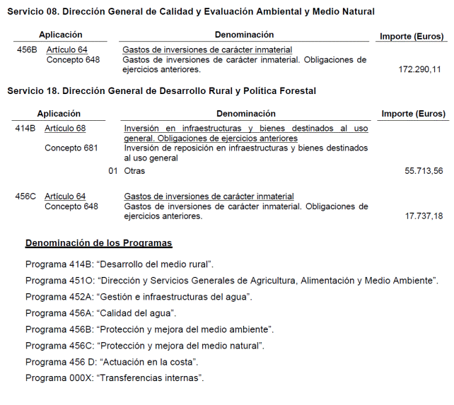Por su parte, las obligaciones pendientes del Ministerio de Agricultura, Alimentación y Medio Ambiente ascienden a 185.039.949,14 euros. De ellas, 126.651.336,56 euros corresponden a la Dirección General del Agua en concepto de certificaciones, revisiones de precios, expropiaciones y otras incidencias relativas a actuaciones inversoras y 8.521.170 euros por actuaciones mediante convenio. Así mismo deben dotarse créditos extraordinarios en el presupuesto de dicha Dirección General por importe de 45.672.216,59 euros para atender al pago de obligaciones de determinadas Confederaciones Hidrográficas y para reponer su tesorería. Finalmente para obligaciones de distintos Servicios del Departamento se conceden créditos por importe de 4.195.225,99 euros.