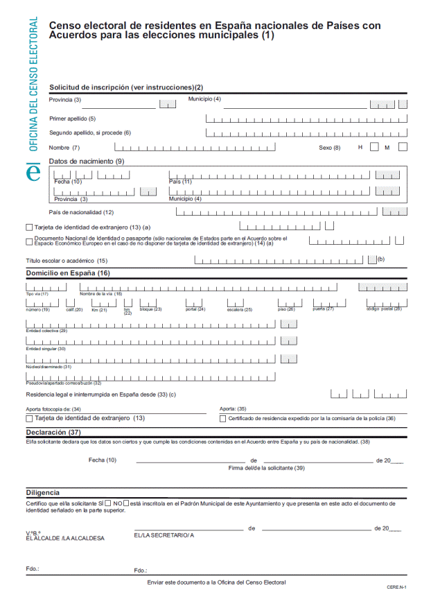 [1] Se deroga por el apartado cuarto de la Resolución de 10 de noviembre de 2022, de la Oficina del Censo Electoral, por la que se establecen los procedimientos y se aprueba el modelo de solicitud para la inscripción en el censo electoral de residentes en España de nacionales de países con acuerdos para las elecciones municipales (BOE del 16), en vigor desde 17 de noviembre de 2022.