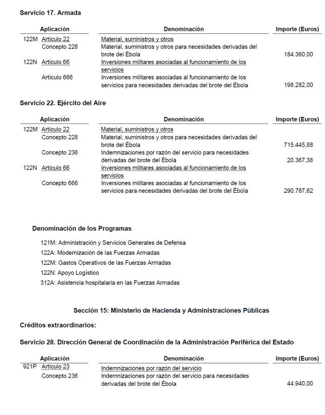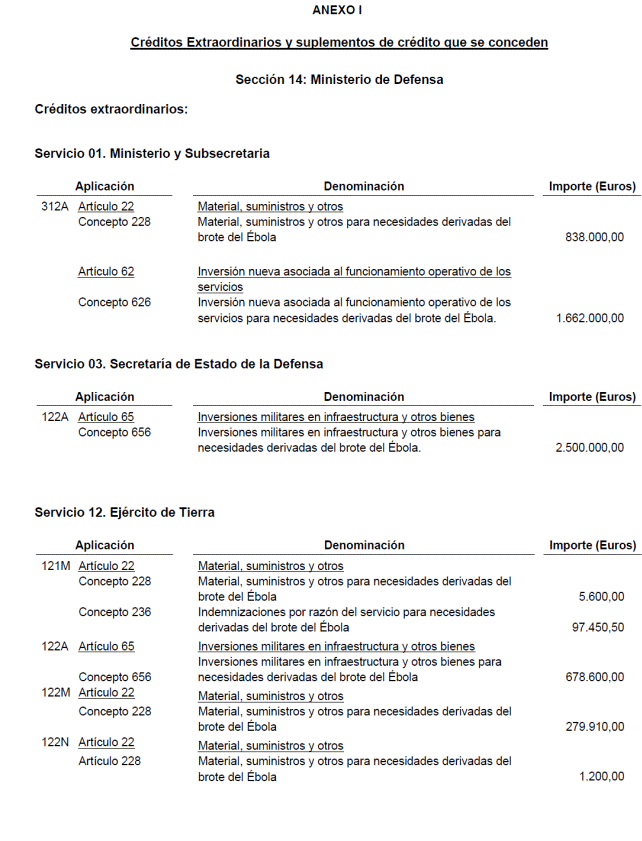 – En el presupuesto del Ministerio de Defensa se conceden créditos extraordinarios y suplementos de crédito por importe total de 7.472.003,38 euros destinados a financiar el equipamiento para atención a situaciones de emergencia por enfermedades altamente infecciosas.