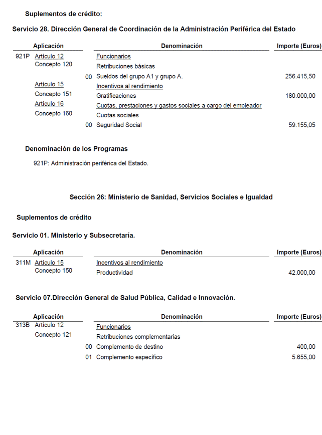 – En el presupuesto del Ministerio de Hacienda y Administraciones Públicas se conceden un crédito extraordinario y suplementos de crédito por importe total de 540.510,55 euros, destinados a reforzar los servicios médicos de las áreas y dependencias de Sanidad integrados en las Delegaciones y Subdelegaciones del Gobierno.
