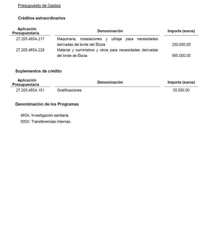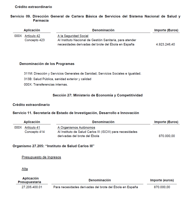 – En el presupuesto del Ministerio de Economía y Competitividad se concede un crédito extraordinario por importe de 870.000,00 euros destinado al Centro Nacional de Microbiología, dependiente del Instituto de Salud Carlos III.