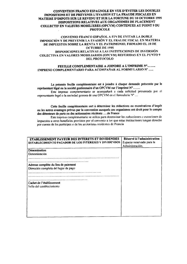 Cada OPCVM constituida en Francia que perciba dividendos o intereses de fuente española podrá solicitar las reducciones, exenciones del impuesto u otros beneficios previstos en el Convenio de 10 de octubre de 1995 para la parte de dichos ingresos que corresponda a los derechos detentados por accionistas o partícipes que sean residentes franceses.