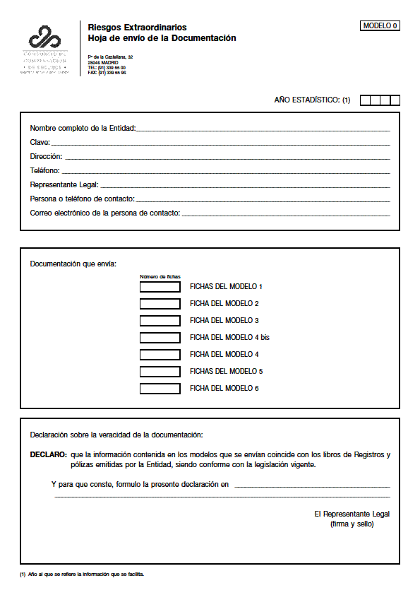 2.2 Las fichas debidamente cumplimentadas a que se refiere el apartado anterior deberán remitirse al Consorcio de Compensación de Seguros antes del día 30 de abril de cada año, conteniendo los datos correspondientes al día 31 de diciembre del año anterior. La remisión se realizará utilizando el modelo 0 del Anexo III, que deberá ir sellado y firmado por el representante legal de la entidad aseguradora, salvo que se utilice para la presentación la vía telemática establecida por el Consorcio.