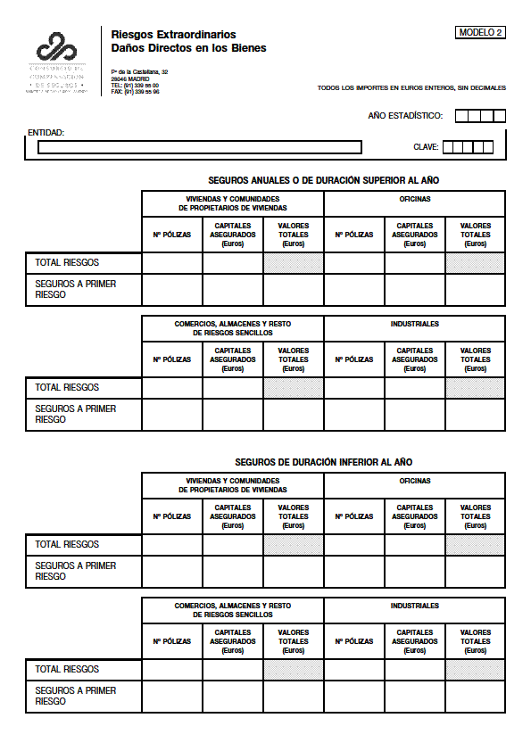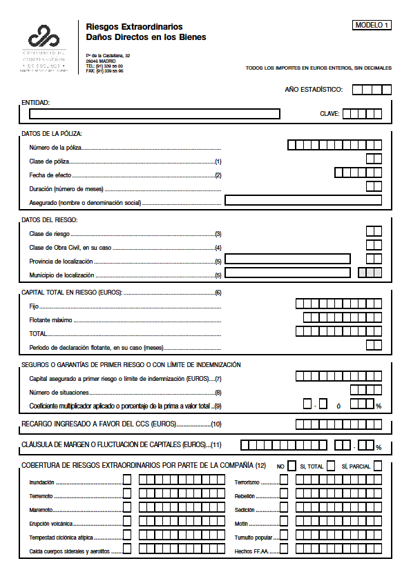 [8] Anexo III modificado por la Resolución de 12 de noviembre de 2008, de la Dirección General de Seguros y Fondos de Pensiones, por la que se modifica la de 27 de noviembre de 2006, por la que se aprueban los recargos en favor del Consorcio de Compensación de Seguros en materia de seguro de riesgos extraordinarios, a satisfacer obligatoriamente por los asegurados, la cláusula de cobertura a insertar en las pólizas de seguro ordinario y la información a facilitar por las entidades aseguradoras relativa a las pólizas incluidas en el régimen de cobertura de los riesgos extraordinario (BOE n.º 280 de 20 de noviembre).