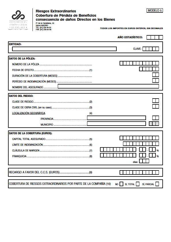 e) Las entidades aseguradoras deberán facilitar la información individualizada de aquellas pólizas de pérdida de beneficios, consecuencia de daños directos en los bienes, cuyo capital total asegurado, para esta cobertura, sea igual o superior a 9.000.000 de euros, aún cuando el límite de indemnización sea por una cifra inferior, mediante la ficha que figura como modelo 5 del anexo III.