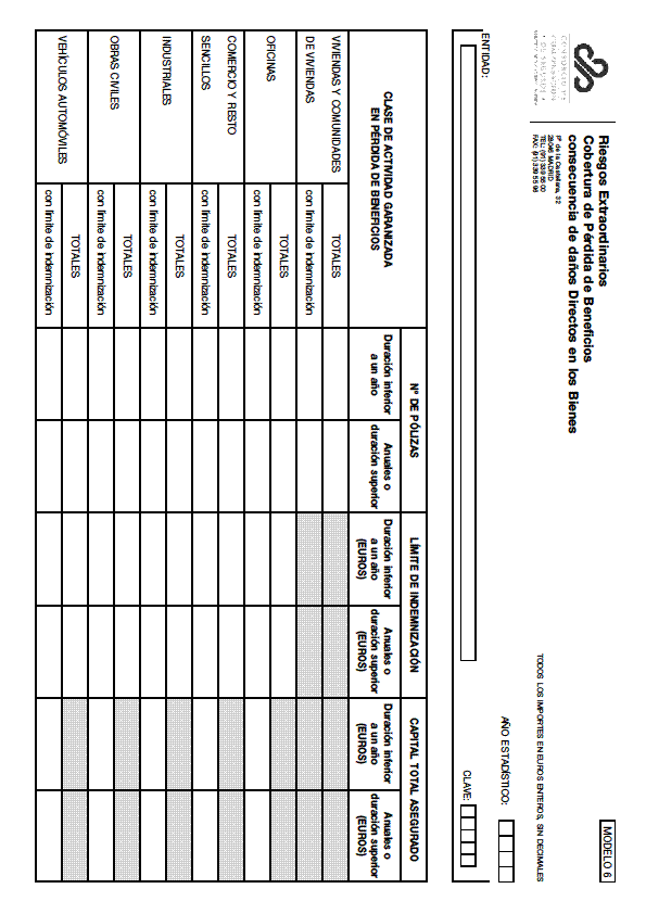 f) Las entidades aseguradoras deberán facilitar información agregada de todas las pólizas que tengan cobertura de pérdida de beneficios consecuencia de daños directos en los bienes, mediante la ficha que figura como modelo 6 del Anexo III.