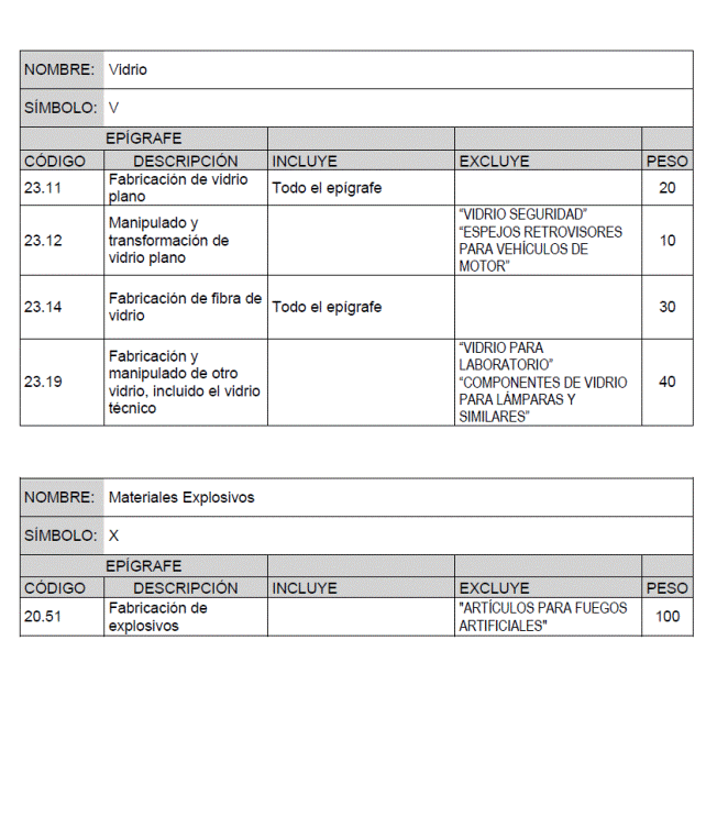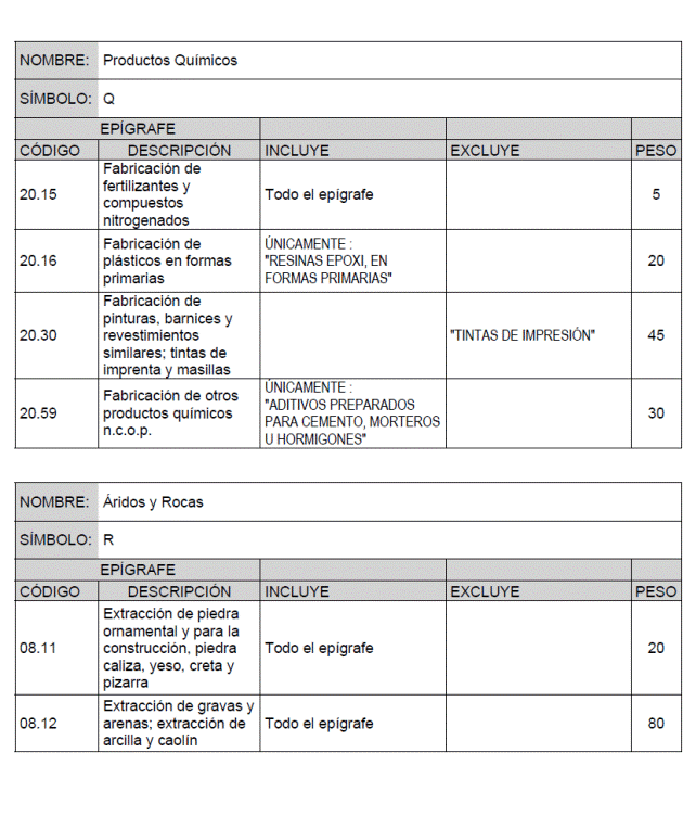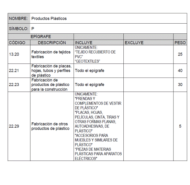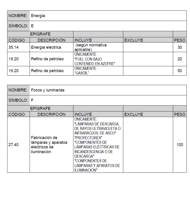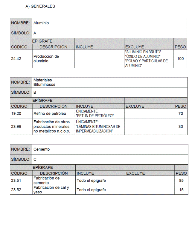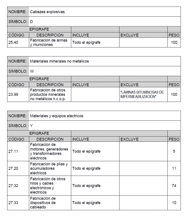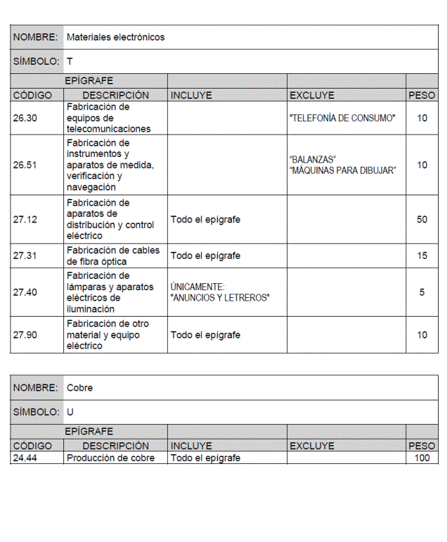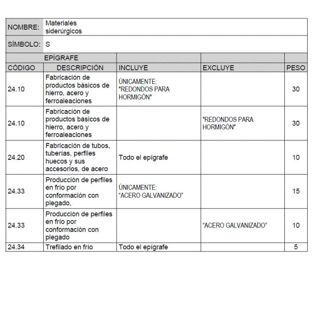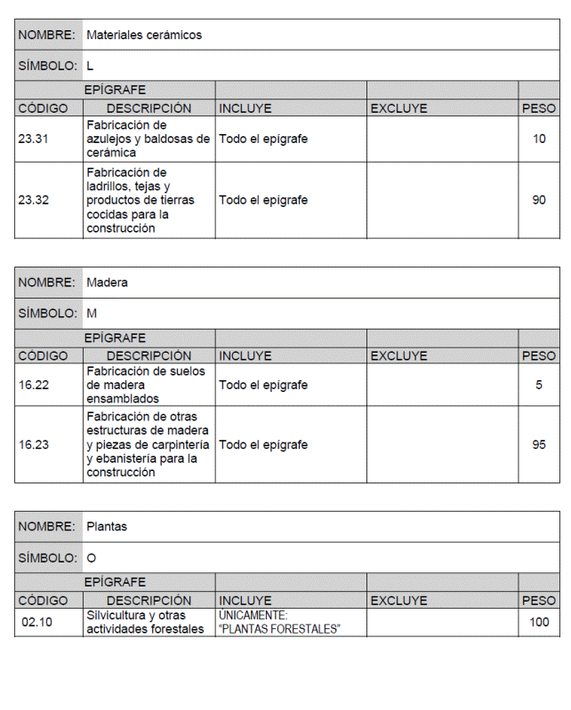 Para cada material básico se recogen los productos o grupos de productos que intervienen en el cálculo de su índice de precios, identificados por el código y descripción del epígrafe que de acuerdo con la Clasificación Nacional de Actividades Económicas (CNAE-2009) les corresponde, junto con la ponderación asignada a cada uno de ellos para el cálculo del índice de precios del material básico correspondiente.