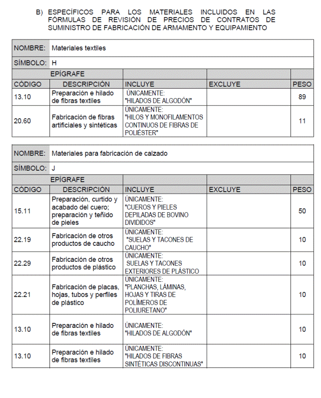 Los índices mensuales de precios de los materiales básicos que intervienen en las fórmulas de revisión de precios se calcularán como la media ponderada de los índices mensuales de precios de los productos y grupos de productos que para cada material básico se recogen a continuación.