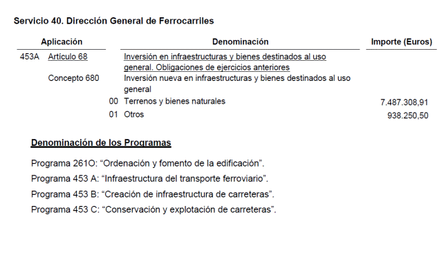 Al Ministerio de Fomento corresponden un total de 540.692.050,73 euros que derivan mayoritariamente de expropiaciones, revisiones de precios, certificaciones finales, intereses y liquidaciones de obras de la Dirección General de Carreteras por importe de 492.163.523,83 euros así como obligaciones relativas a conservación integral y de energía eléctrica de la propia Dirección General de Carreteras por importe de 38.531.783,59 euros. Por su parte, la Dirección General de Ferrocarriles debe atender obligaciones por importe de 8.425.559,41 euros correspondientes a expropiaciones, liquidaciones de obra e intereses de demora y la Dirección General de Arquitectura, Vivienda y Suelo por importe de 1.571.183,90 euros relativas fundamentalmente a certificaciones.