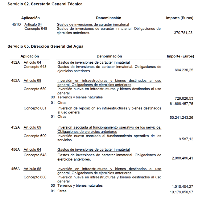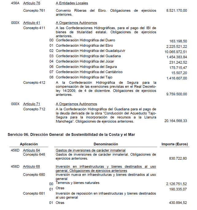Por su parte, las obligaciones pendientes del Ministerio de Agricultura, Alimentación y Medio Ambiente ascienden a 185.039.949,14 euros. De ellas, 126.651.336,56 euros corresponden a la Dirección General del Agua en concepto de certificaciones, revisiones de precios, expropiaciones y otras incidencias relativas a actuaciones inversoras y 8.521.170 euros por actuaciones mediante convenio. Así mismo deben dotarse créditos extraordinarios en el presupuesto de dicha Dirección General por importe de 45.672.216,59 euros para atender al pago de obligaciones de determinadas Confederaciones Hidrográficas y para reponer su tesorería. Finalmente para obligaciones de distintos Servicios del Departamento se conceden créditos por importe de 4.195.225,99 euros.