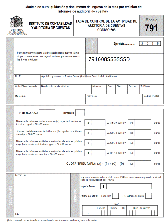 Se aprueba el modelo de autoliquidación y documento de ingreso de la tasa prevista en el artículo 44 del texto refundido de la Ley de Auditoría de Cuentas que figura en el anexo de esta orden, en el que se han actualizado las cuantías fijas de la tasa, en aplicación de lo establecido en la Ley 36/2014, de 26 de diciembre, de Presupuestos Generales del Estado para el año 2015.
