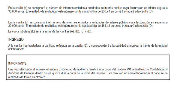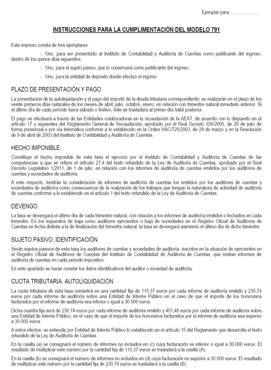 La presentación de este modelo de impreso de declaración-liquidación, así como el pago de la tasa, se podrá realizar de forma telemática, conforme a lo previsto en la Orden HAC/729/2003, de 28 marzo, que establece los supuestos y las condiciones generales para el pago por vía telemática de las tasas que constituyen recursos de la Administración General del Estado y sus Organismos Públicos, y en la Resolución de 9 de abril de 2003, del Instituto de Contabilidad y Auditoría de Cuentas, por la que se establece la aplicación del procedimiento para la presentación de la autoliquidación y las condiciones para el pago por vía telemática de la tasa prevista en el artículo 23 de la Ley 19/1988, de 12 de julio, de Auditoría de Cuentas, actualmente recogida en el artículo 44 del texto refundido de la Ley de Auditoría de Cuentas, aprobado por el Real Decreto Legislativo 1/2011, de 1 de julio.