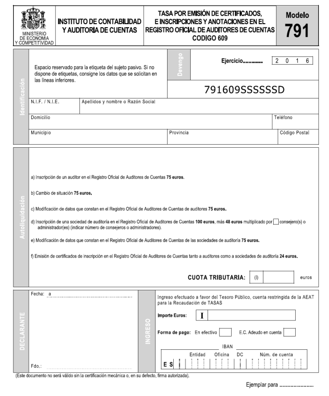 En cumplimiento del artículo 88, apartado 7, de la Ley 22/2015, de 20 de julio, en el Real Decreto 73/2016, de 19 de febrero, se desarrolla el régimen de autoliquidación y pago de la tasa del Instituto de Contabilidad y Auditoría de Cuentas por la expedición de certificados o documentos a instancia de parte y por las inscripciones y anotaciones en el Registro Oficial de Auditores de Cuentas, en el que se determinan reglamentariamente las normas de liquidación y pago de la tasa, estableciendo asimismo la obligación para los sujetos pasivos de autoliquidación e ingreso del importe fijado en la Ley 22/2015, de 20 de julio. Asimismo en la disposición final segunda del citado Real Decreto, se habilita al Ministro de Economía y Competitividad para determinar el modelo de autoliquidación y pago de la tasa.