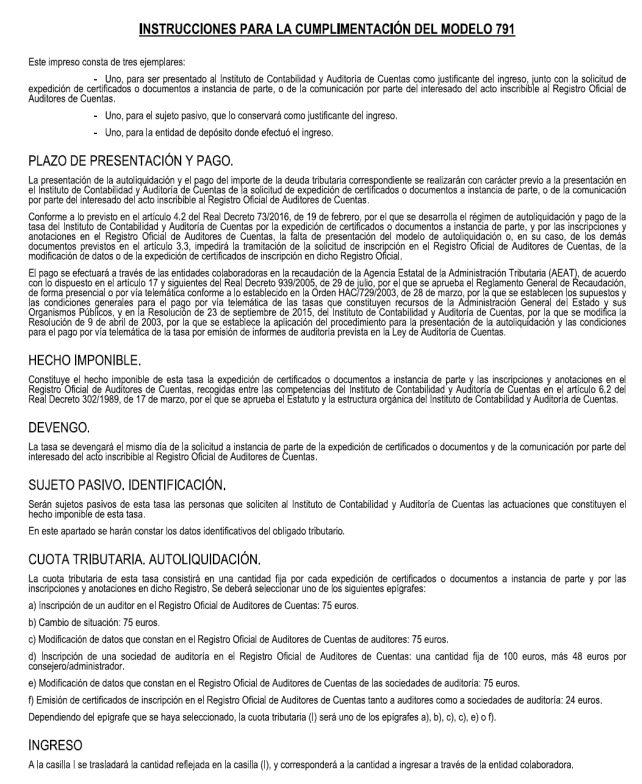 La presentación de este modelo de impreso de declaración-liquidación, así como el pago de la tasa, se podrá realizar de forma telemática, conforme a lo previsto en la Orden HAC/729/2003, de 28 marzo, por la que se establecen los supuestos y las condiciones generales para el pago por vía telemática de las tasas que constituyen recursos de la Administración General del Estado y sus organismos públicos, y en la Resolución de 23 de septiembre de 2015, del Instituto de Contabilidad y Auditoría de Cuentas, por la que se modifica la Resolución de 9 de abril de 2003, por la que se establece la aplicación del procedimiento para la presentación de la autoliquidación y las condiciones para el pago por vía telemática de la tasa por emisión de informes de auditoría prevista en la Ley de Auditoría de Cuentas.