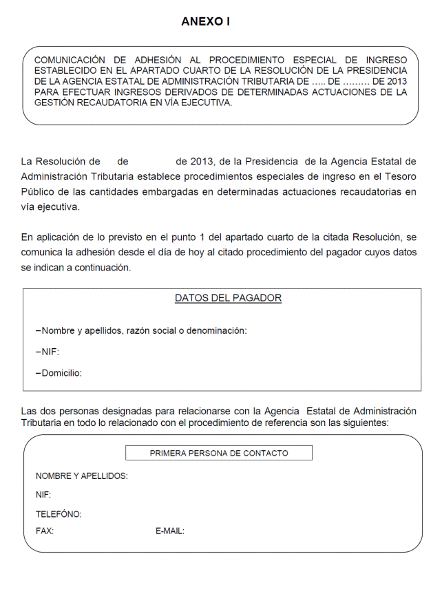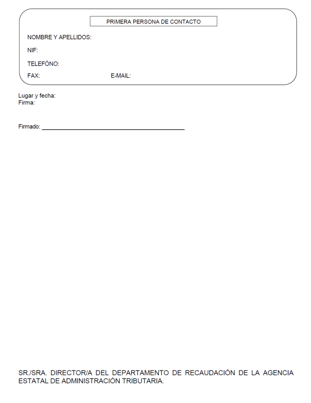 1. Adhesión. Aquellos pagadores, públicos o privados, interesados en adherirse al procedimiento que se regula en este apartado deberán comunicarlo al titular del Departamento de Recaudación por cualquier medio que permita tener constancia de su recepción, haciendo constar el nombre y apellidos de dos personas encargadas para relacionarse en esta materia con la Agencia Estatal de Administración Tributaria, así como sus respectivos números de teléfono, fax y direcciones de correo electrónico (modelo de adhesión en el anexo I).