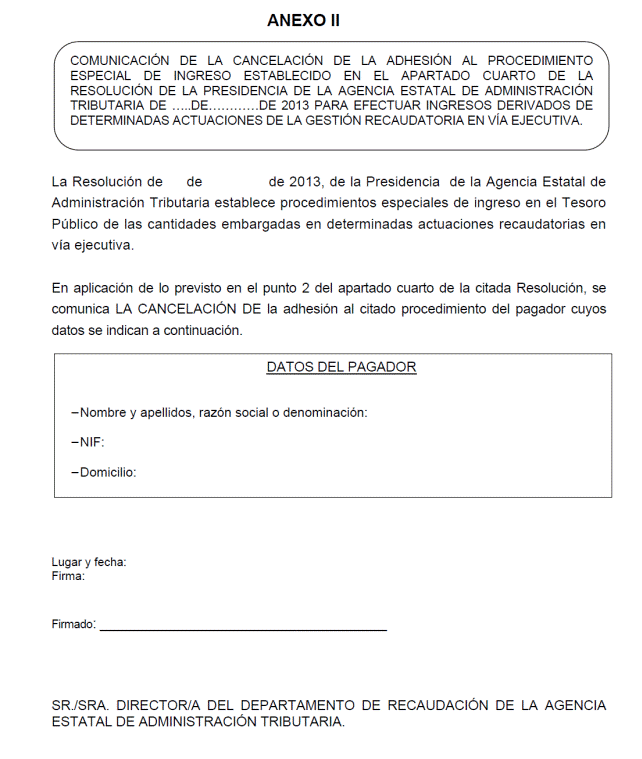 2. Baja en el procedimiento. Aquellos pagadores que deseen dejar sin efecto su adhesión al procedimiento establecido en esta Resolución deberán comunicarlo al Departamento de Recaudación de la Agencia Estatal de Administración Tributaria, por cualquier medio que permita tener constancia de su recepción (modelo de baja en el anexo II).