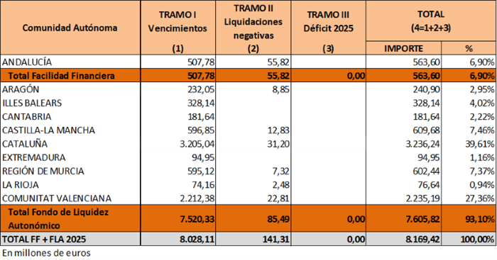 En concreto, se destinan 7.605,8 millones de euros al compartimento Fondo de Liquidez Autonómico (FLA) y los 563,6 millones restantes al compartimento Facilidad Financiera (FF).