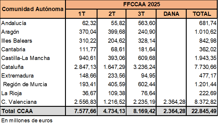 De esta forma, el Fondo de Financiación a CCAA lleva distribuidos 22.845,5 millones de euros a las Comunidades Autónomas en los tres primeros trimestres del año, sumando los 2.364 millones de euros de este Fondo acordados a inicios de marzo de este año, y que se asignaron a la Comunitat Valenciana para cubrir los gastos extraordinarios no financieros que tendrá la Generalitat este año para poder dar respuesta a la situación de emergencia derivada de la DANA. Así lo detalla este cuadro: