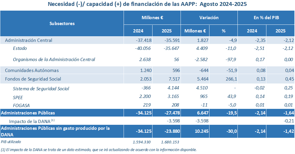 Hasta el octavo mes de 2025, el déficit conjunto de la Administración Central, los Fondos de la Seguridad Social y las Comunidades Autónomas se sitúa en 27.478 millones, equivalente al 1,64% del PIB. Si se excluye el impacto por la DANA de 3.598 millones, el déficit se sitúa en 23.880 millones de euros. Es decir, sin tener en cuenta este impacto el déficit se reduce en un 30% hasta el 1,42% del PIB.