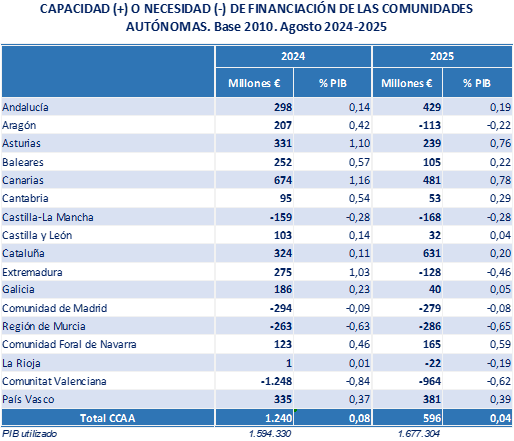 La Administración Regional registra un superávit a finales de agosto de 2025 de 596 millones de euros, lo que equivale al 0,04% del PIB.