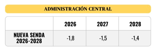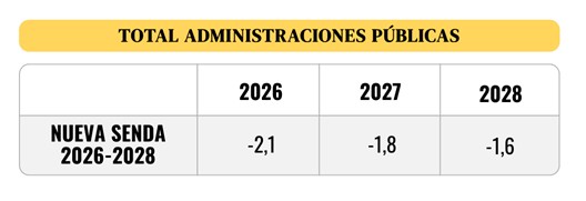 En 2026, el conjunto de las Administraciones Públicas deberá situar su déficit en el -2,1%. Para 2027 y 2028, se reducirá al -1,8% y el -1,6% respectivamente.
