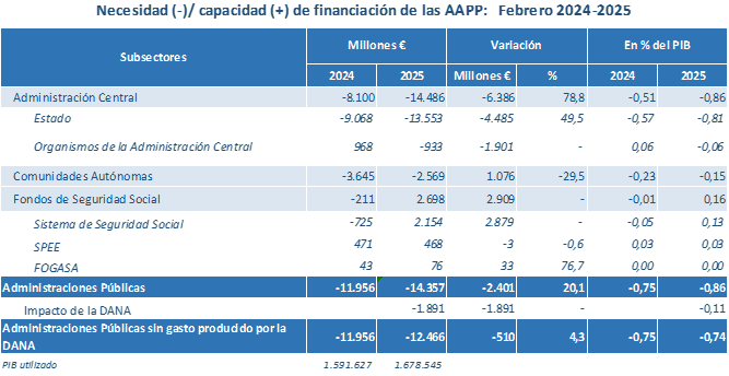 En febrero de 2025, el déficit conjunto de la Administración Central, los Fondos de la Seguridad Social y las Comunidades Autónomas se sitúa en 14.357 millones, equivalente al 0,86% del PIB. Si se tiene en cuenta el impacto producido por la DANA de 1.891 millones, el déficit alcanza los 12.466 millones de euros. Es decir, sin tener en cuenta este impacto el déficit se reduce en una décima hasta el 0,74%.