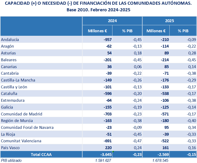 • Las CCAA alcanzan en febrero un déficit del 0,15% del PIB, al reducirse un 29,5%, respecto al mismo periodo del ejercicio anterior
