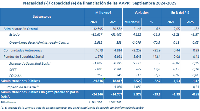 Hasta el noveno mes de 2025, el déficit conjunto de la Administración Central, los Fondos de la Seguridad Social y las Comunidades Autónomas se sitúa en 18.817 millones, equivalente al 1,12% del PIB. Si se excluye el impacto por la DANA de 4.050 millones, el déficit se sitúa en 14.767 millones de euros. Es decir, sin tener en cuenta este impacto el déficit se reduce en un 39,3% hasta el 0,88% del PIB.