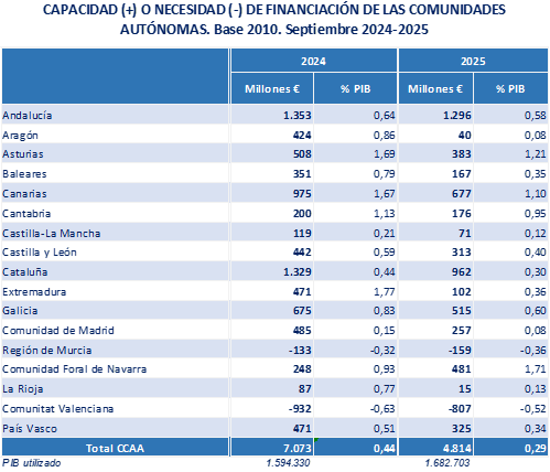 La Administración Regional registra un superávit a finales de septiembre de 2025 de 4.814 millones de euros, lo que equivale al 0,29% del PIB.