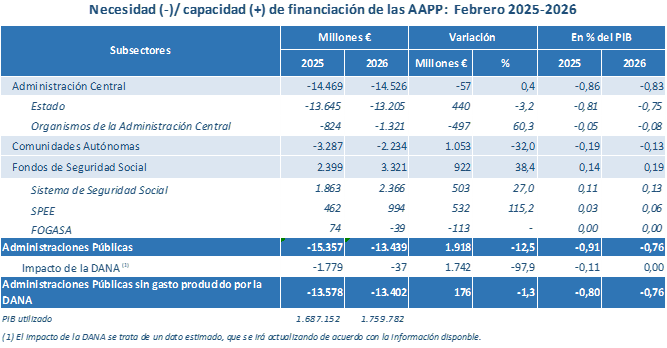 La Administración Central ha obtenido en febrero de 2026 un déficit de 14.526 millones, equivalente al 0,83% del PIB, lo que supone una reducción en 0,03 puntos porcentuales, desde el 0,86% registrado un año antes.
