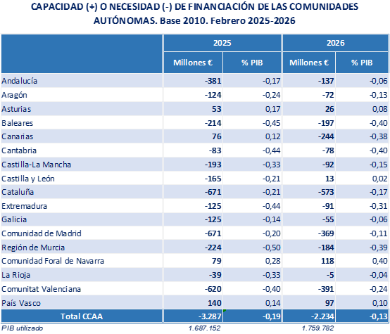 La Administración Regional registra a finales de febrero de 2026 un déficit de 2.234 millones, lo que equivale al 0,13% del PIB, frente al 0,19% del mismo periodo de 2025. En términos absolutos, el déficit se reduce un 32%.
